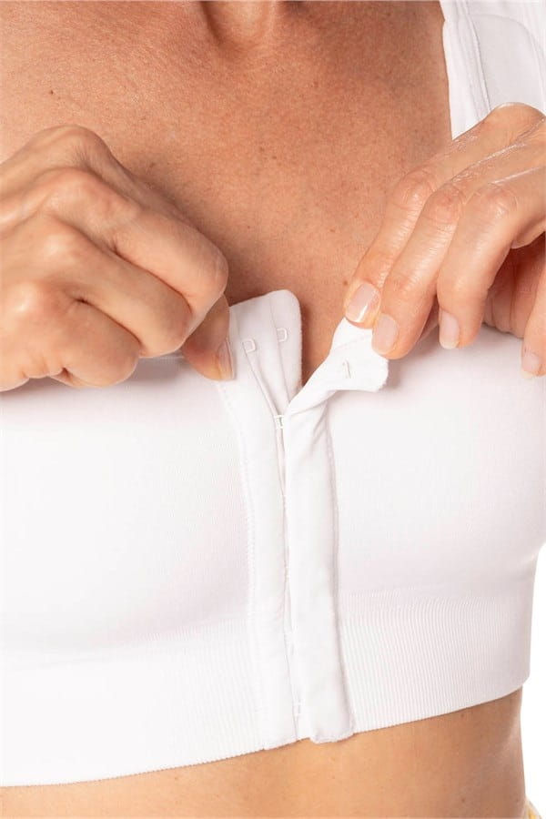 ➡️ Delikatny rzep z tyłu biustonosza pozwala bezpiecznie przymocować pas kompresyjny.
