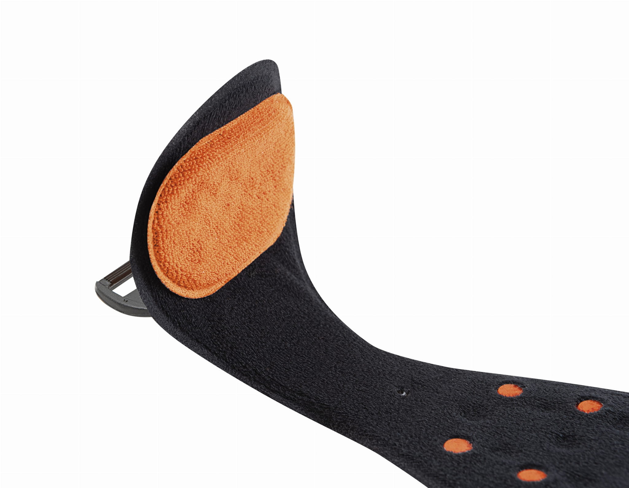 Elementy silikonowe mają bezpośredni kontakt ze skórą, dzięki temu zapobiegają przesuwaniu się ortezy na przedramieniu.