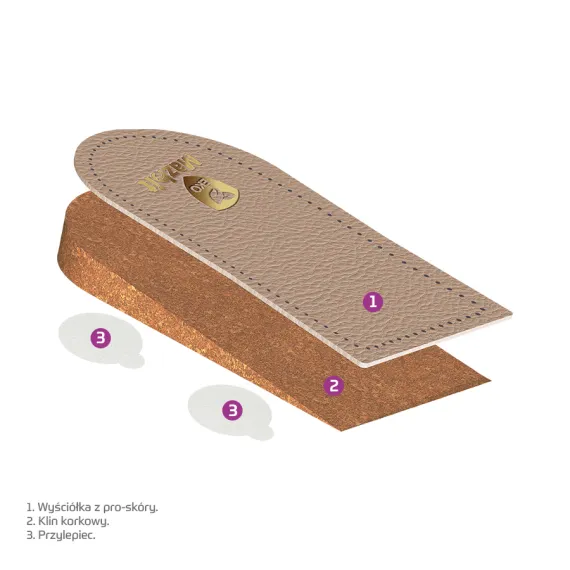 Zastosowany w nich wydłużony profil korkowy pozwala podeprzeć piętę krótszej nogi i tym samym wyrównać asymetrię długości nóg bez konieczności kupowania dwóch różnych butów i stosowania obcasów. Kliny umożliwiają wyrównanie skrótu o 5,10, 15, 20 lub 25 mm. Wyściółka z pro-skóry jest przyjemna w dotyku i zmniejsza ryzyko odparzeń oraz powstawania odcisków. Do utrzymania jej w czystości wystarczy wilgotna szmatka i delikatny detergent