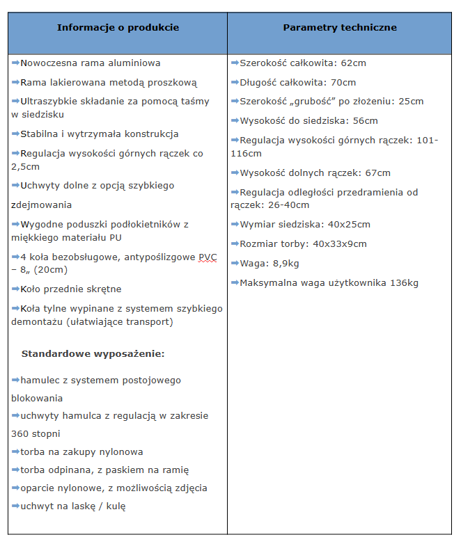 Podpórka wyposażona jest w siedzisko z oparciem umożliwiające odpoczynek podczas długich spacerów oraz niezwykle praktyczną torbę na zakupy i uchwyt na kulę, laskę